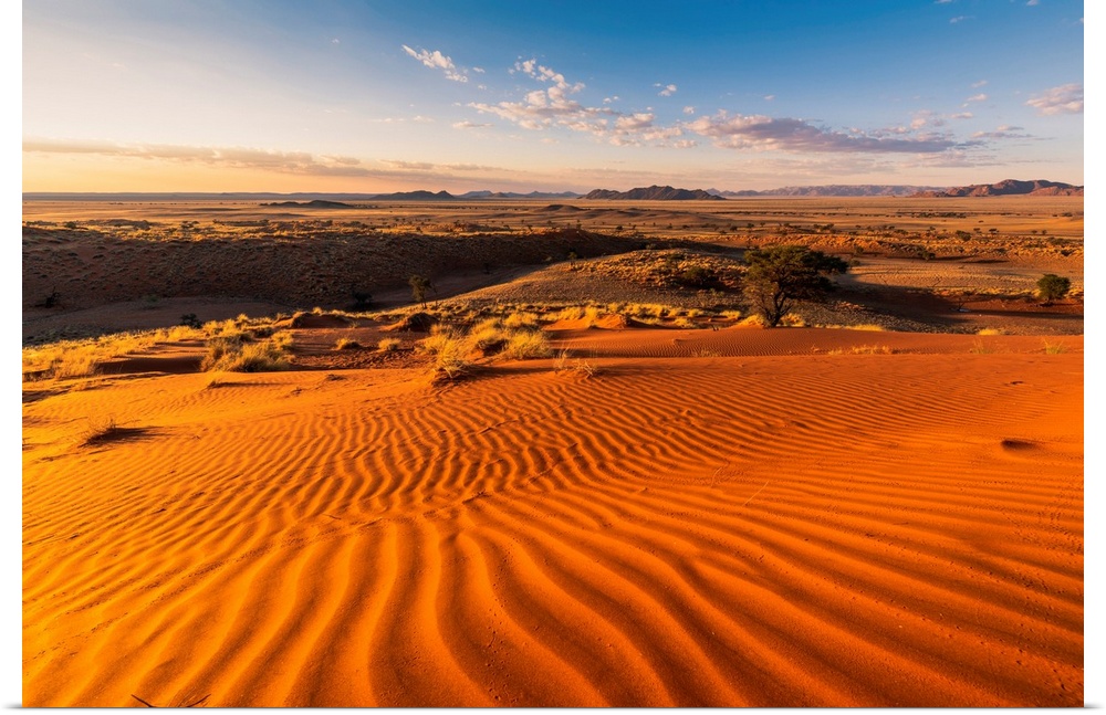 <p>Namib-Naukluft National Park, Namibia, Africa. Ripples Of Sand On A Petrified Dune At Sunset.</p>