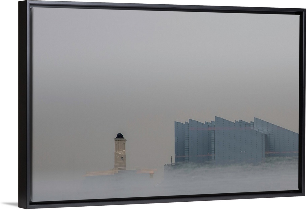 <p>Fine art photograph of a repeated city building on a gray sky with mist at the bottom rising up.</p>