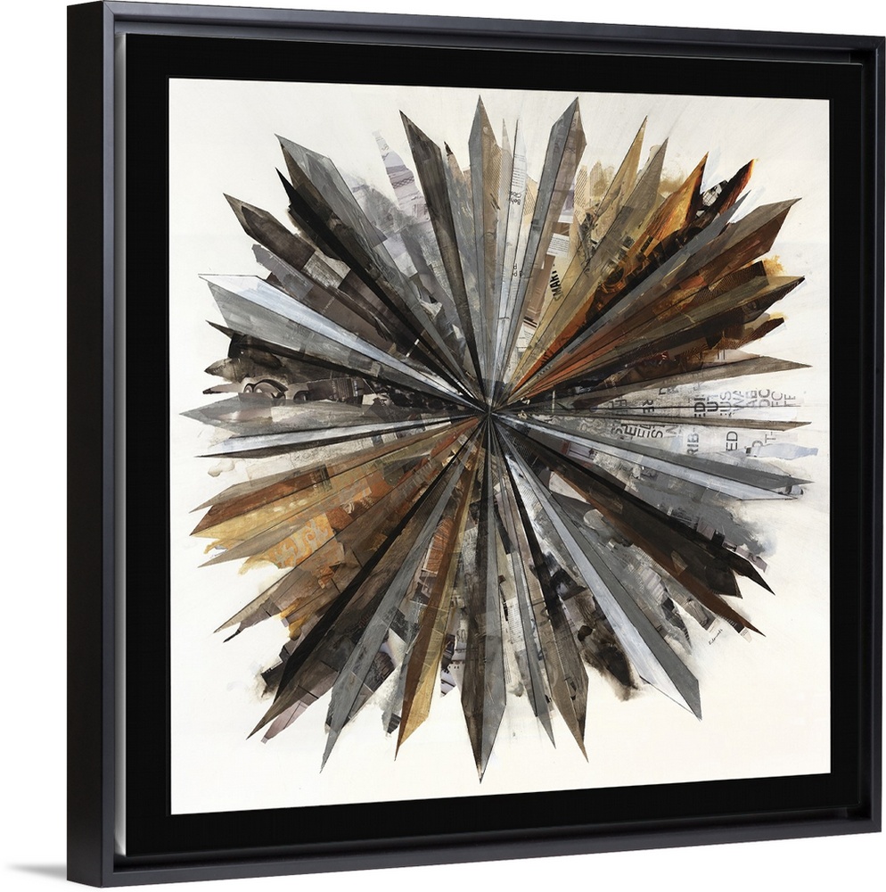 <p>Graphic art of overlapping beams of paint and printed material that are combined to create a starburst in earth tones, on a solid white background.</p>