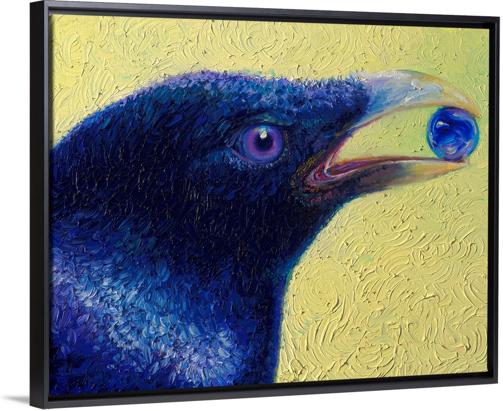 <p>Brightly colored contemporary artwork of a black bird holding a marble.</p>