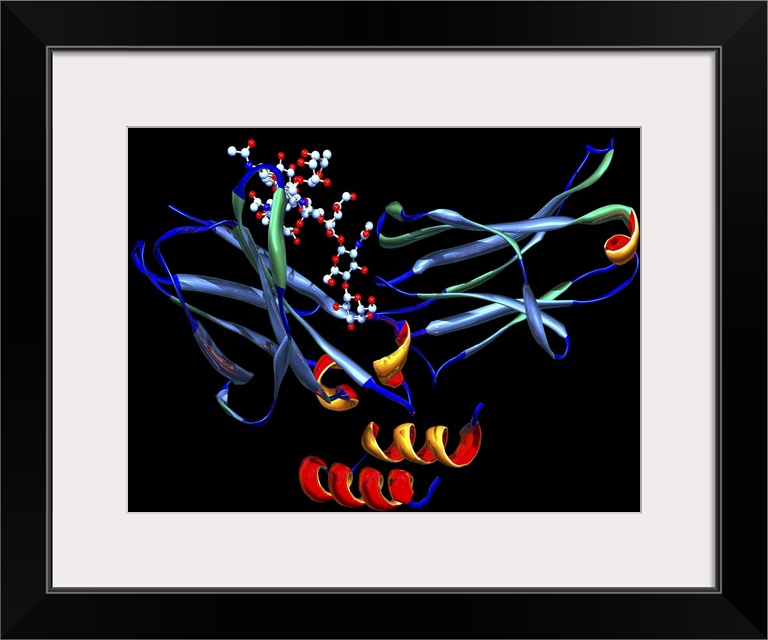 <p>Rituximab drug molecule. Computer model showing the secondary structure of the drug rituximab (marketed as MabThera). The primary structure of an oligosaccharide (sugar) is at upper left. Oligosaccharides are necessary for the biological activity of proteins. Rituximab is a monoclonal antibody that binds to CD20 receptors on the surface of B cells (white blood cells), flagging them for destruction by the immune system. It is used to treat rheumatoid arthritis, which is caused by the immune system attacking the body's own tissues. By reducing the number of B cells, symptoms can be reduced. It is also used to treat B cell non-Hodgkin's lymphoma and B cell leukaemia as it clears cancerous B cells from the blood, allowing them to be replaced with healthy cells.</p>