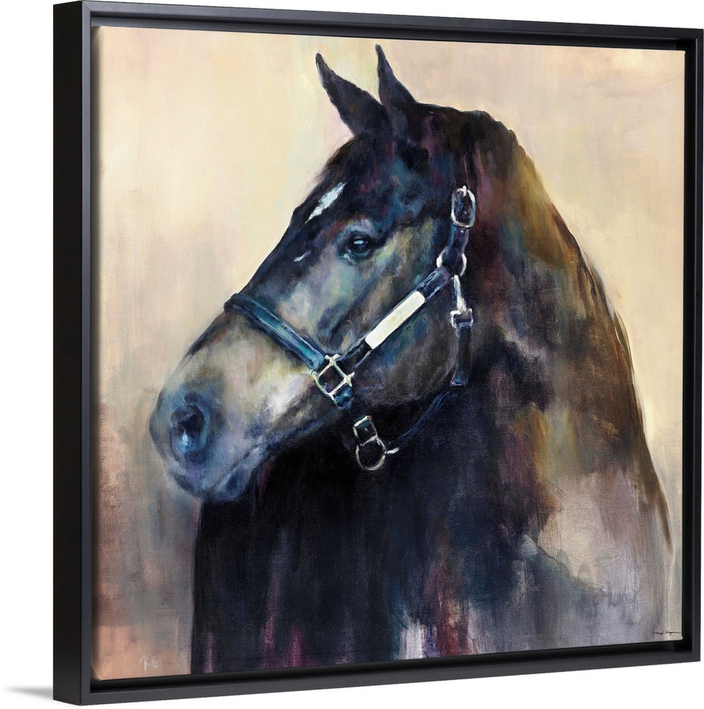 <p>Contemporary painting of a dark horse with cool hues.</p>