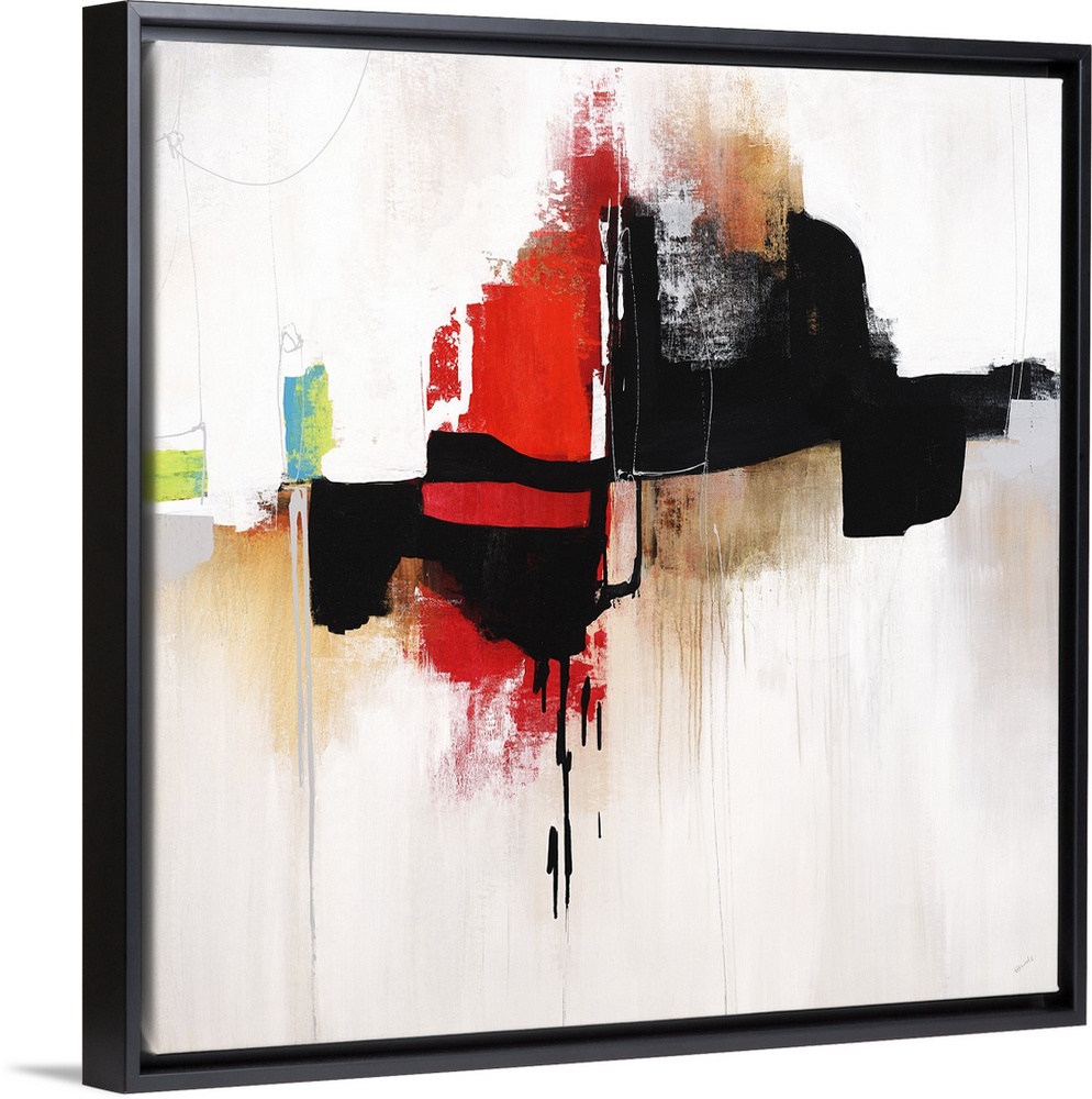 <p>Square abstract art with bold black and red designs in the middle and gold and silver hues dripping down from around them and bright green and blue shapes on the side.</p>