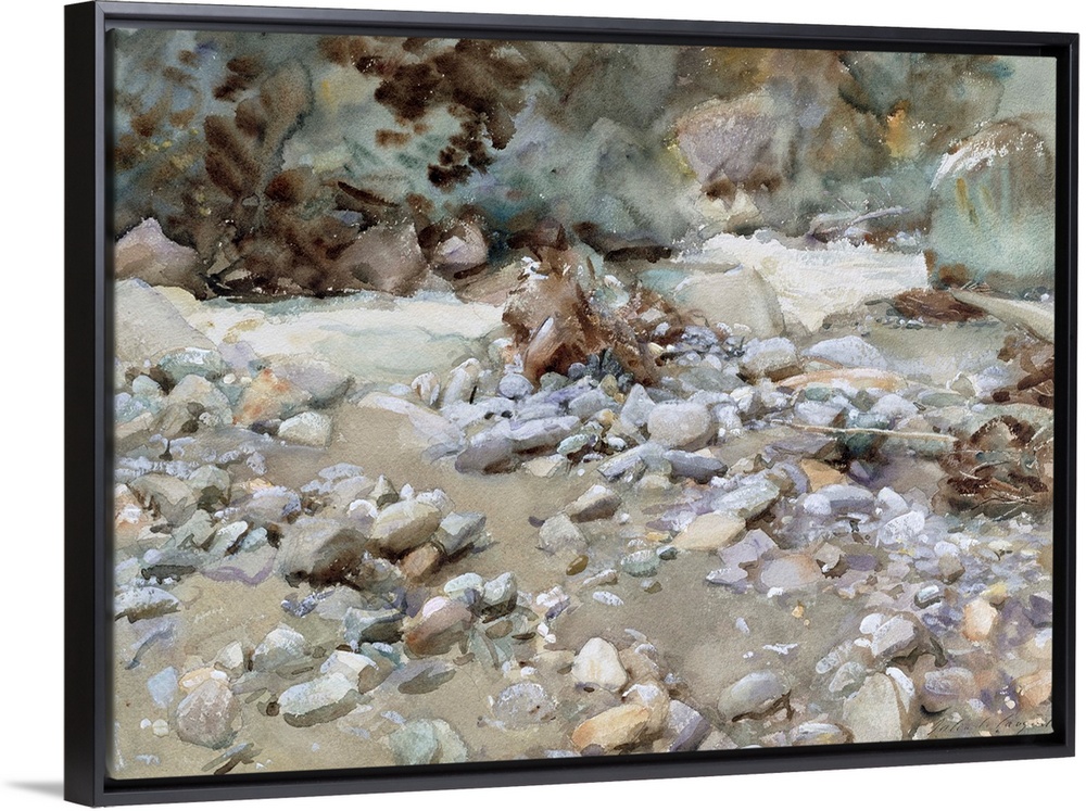 <p>Watercolor painting of rocks of different sizes and colors laying along a riverbed.</p>
