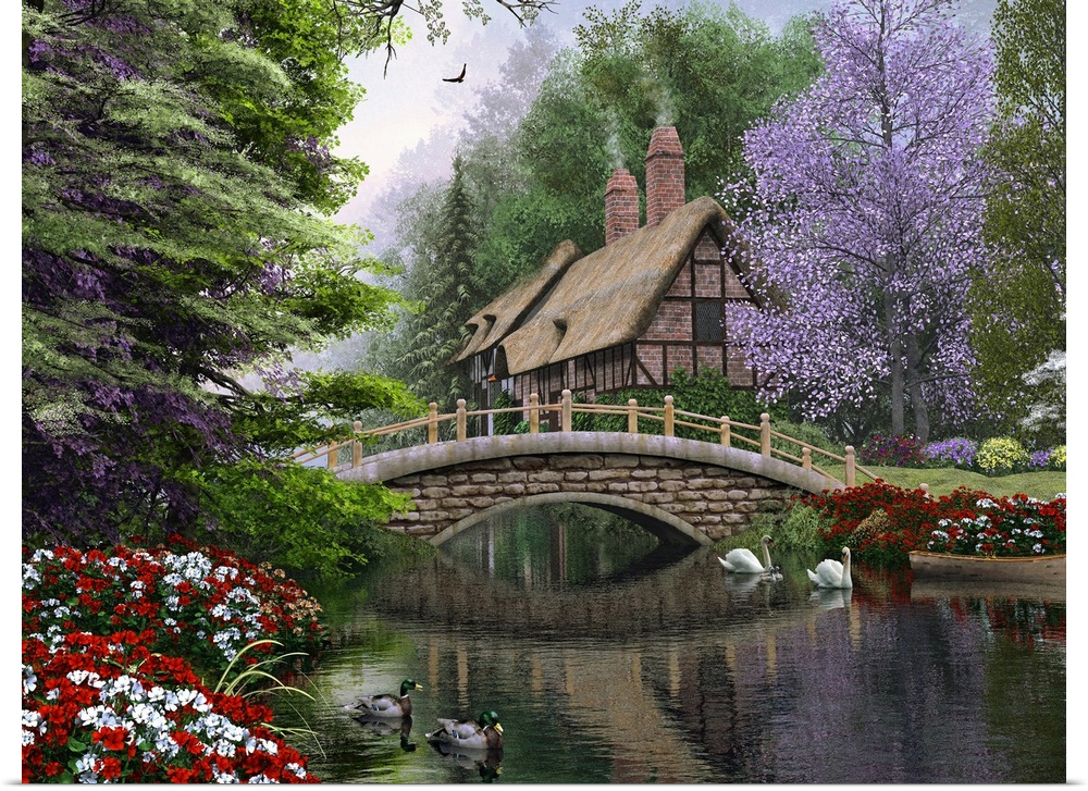 <p>Contemporary painting of a river with a cottage along side of it and a small bridge with birds in the water in front of it.</p>