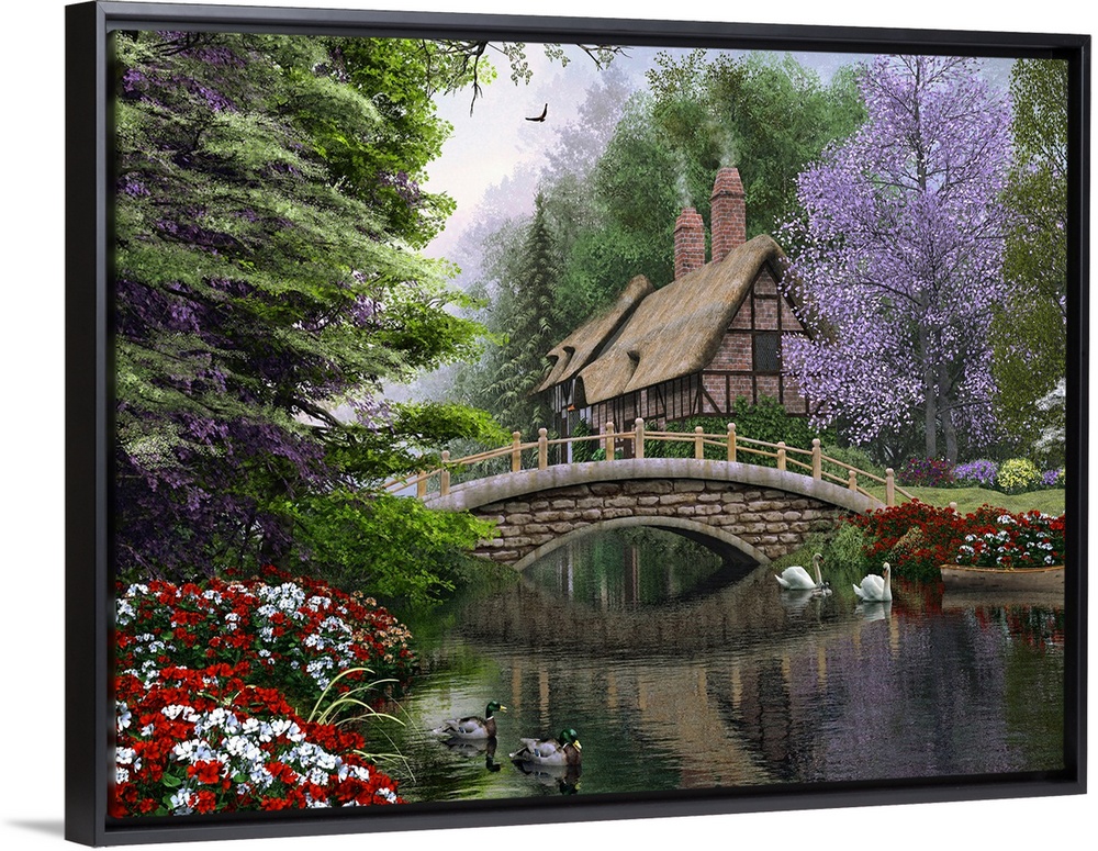 <p>Contemporary painting of a river with a cottage along side of it and a small bridge with birds in the water in front of it.</p>