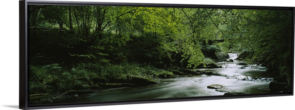 <p>Wide angle photograph of a river running through an overgrown, green forest in Aberfeldy, Perth shire, Scotland.</p>