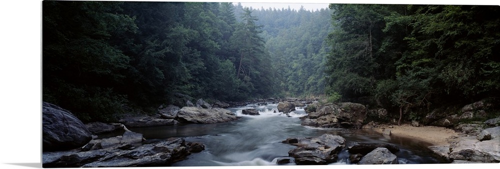 <p>Large panoramic picture taken of a river cutting through immense trees with rocks lining the sides and sitting in the middle of the river.</p>