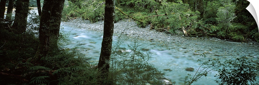 <p>River flowing through a forest, Routeburn River, Mt Aspiring National Park, South Island, New Zealand</p>
