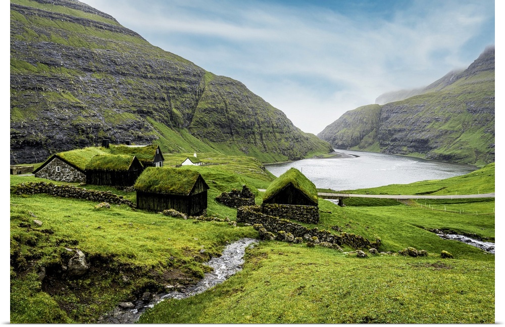 <p>River flowing to the ocean crossing green meadows with grass-roof houses, Saksun, Streymoy Island, Faroe Islands, Denmark, Europe</p>