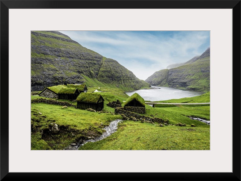 <p>River flowing to the ocean crossing green meadows with grass-roof houses, Saksun, Streymoy Island, Faroe Islands, Denmark, Europe</p>