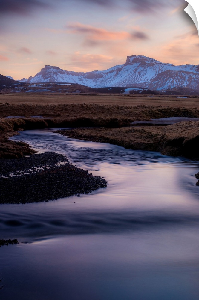 <p>Landscape photograph of a winding river in a frozen valley with snow covered mountains in the distance.</p>