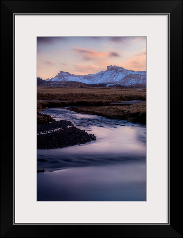 <p>Landscape photograph of a winding river in a frozen valley with snow covered mountains in the distance.</p>