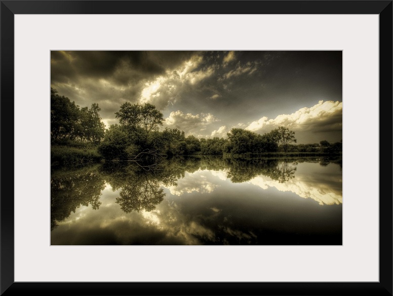 <p>A rural scene with trees and clouds reflected in the calm waters of a lake</p>
