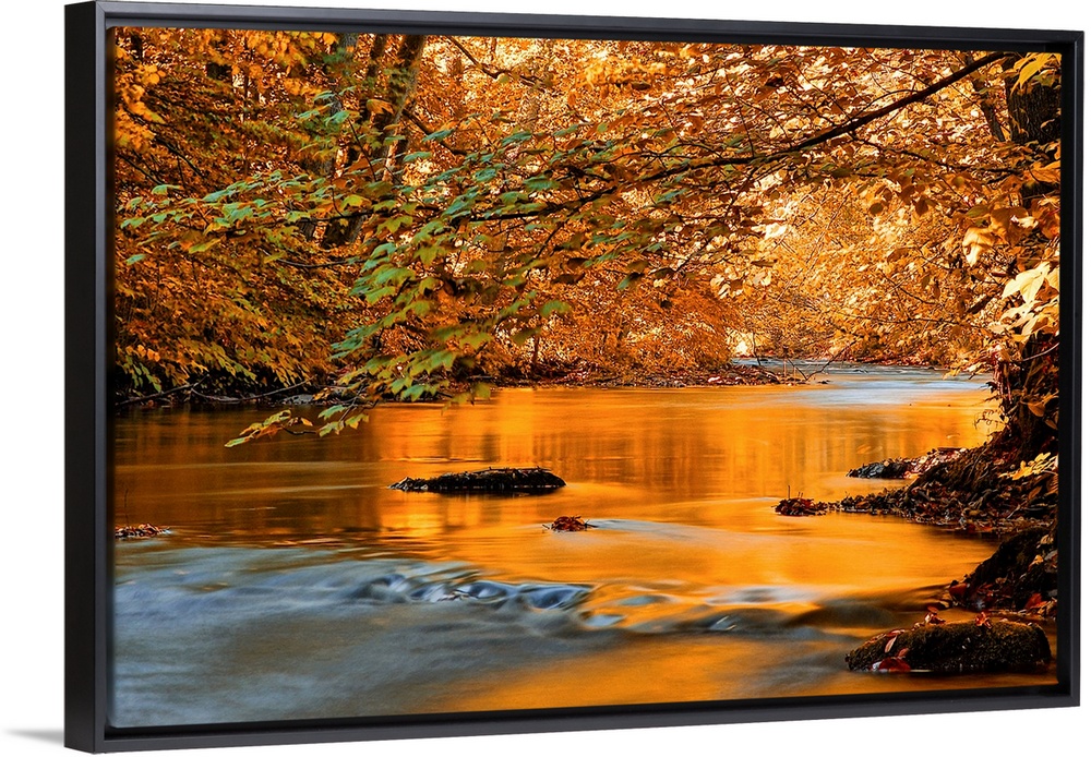 <p>Photograph of winding creek with trees on both sides. The trees are filled with fall foliage.</p>