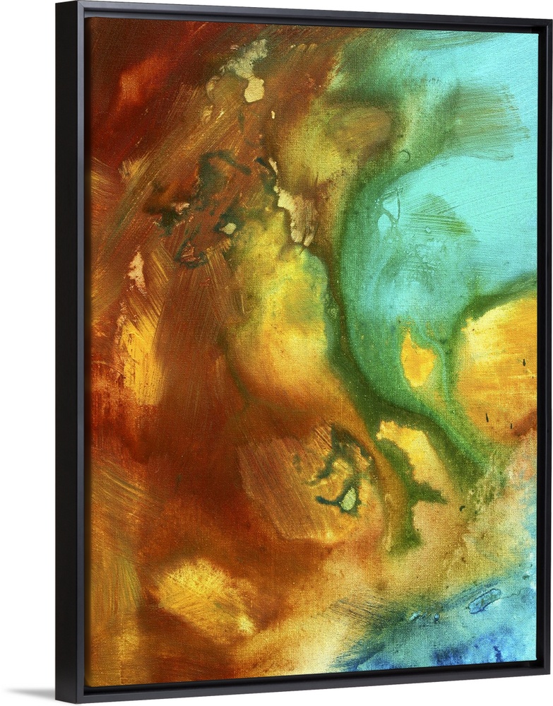 <p>This is a huge colorful and bold original abstract painting unique and very distinct in contemporary style. The fluid colors of rust, yellows and turquoise create drama and boldness in this beautiful artwork.</p>