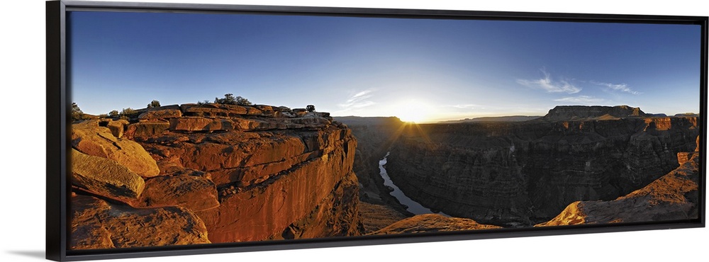 <p>A large panoramic photograph of the Grand Canyon with the river running through it and the sun setting on the horizon.</p>
