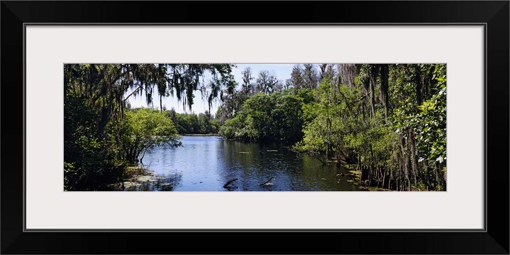 <p>Oversized landscape photograph looking down the Hillsborough River, surrounded by tall green trees and foliage in Lettuce Lake Park, in Tampa, Florida.</p>