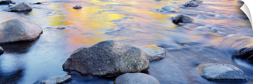 <p>Horizontal, big photograph of large rocks in a river, golden autumn colors reflecting in the waters from above.</p>