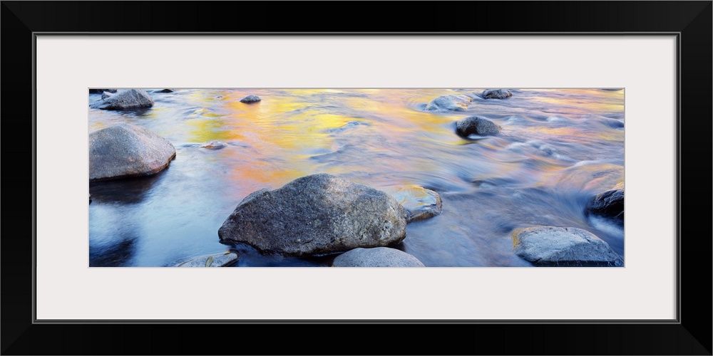 <p>Horizontal, big photograph of large rocks in a river, golden autumn colors reflecting in the waters from above.</p>