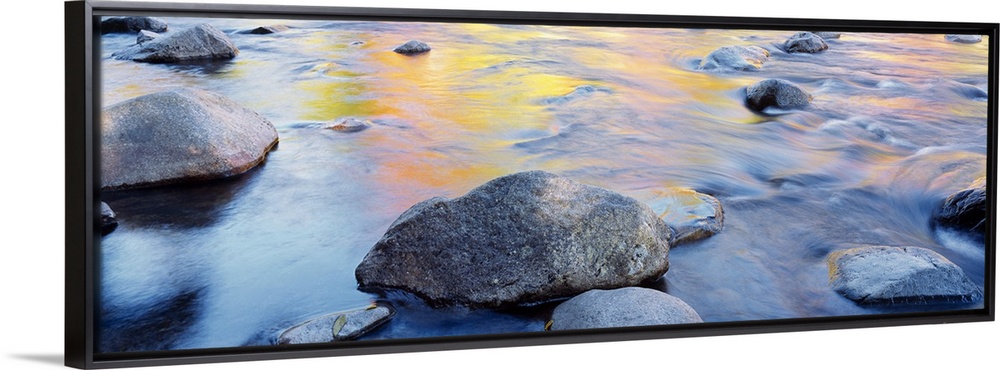 <p>Horizontal, big photograph of large rocks in a river, golden autumn colors reflecting in the waters from above.</p>