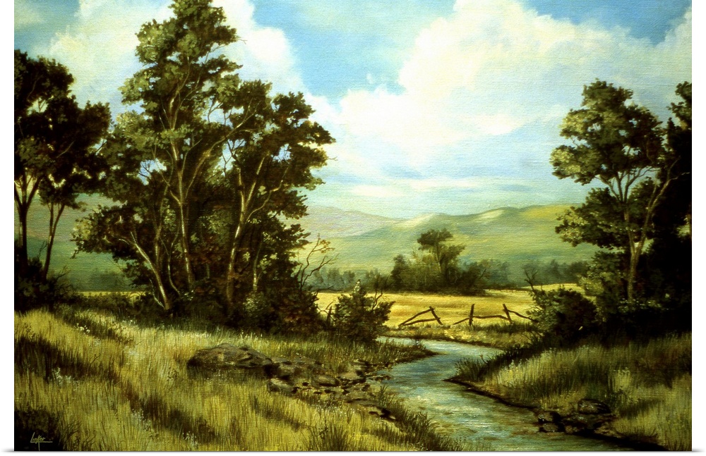 <p>Contemporary painting of a stream cutting through a grove.</p>