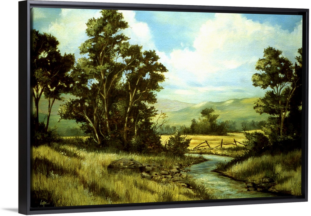 <p>Contemporary painting of a stream cutting through a grove.</p>