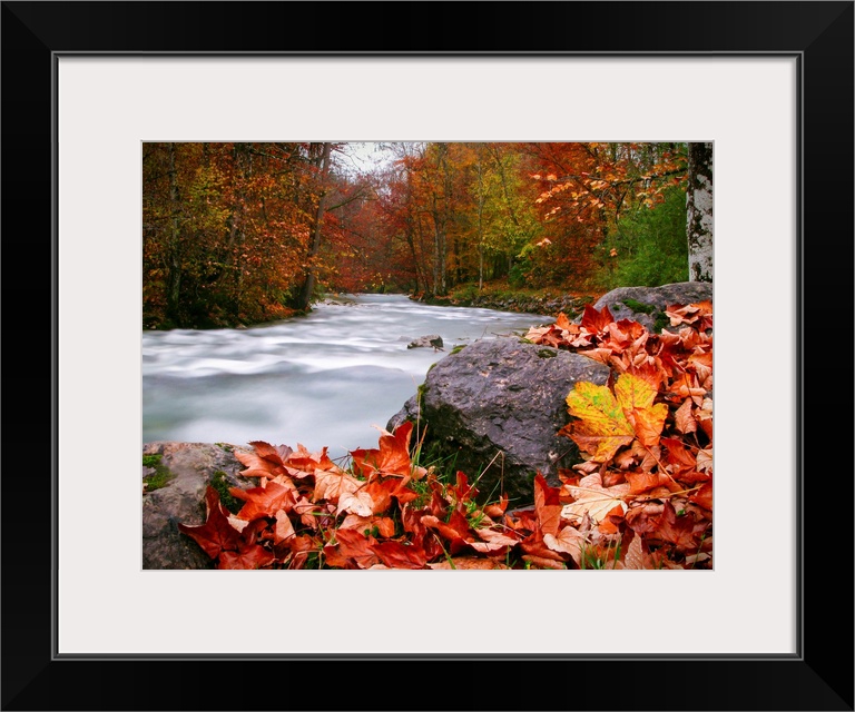 <p>Long exposure photograph of a rushing river in the forest with red and yellow Autumn leaves on the ground.</p>