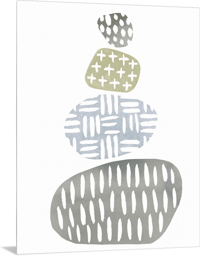<p>Watercolor painting of four stacked river rocks, each with its own pattern.</p>