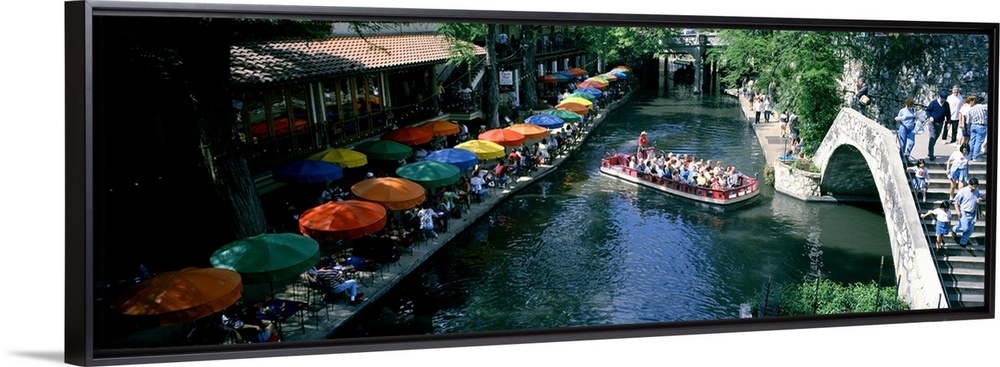 <p>A panoramic picture of a river in Texas that is lined with tables that have colorful umbrellas and a small passenger boat floating down the water.</p>