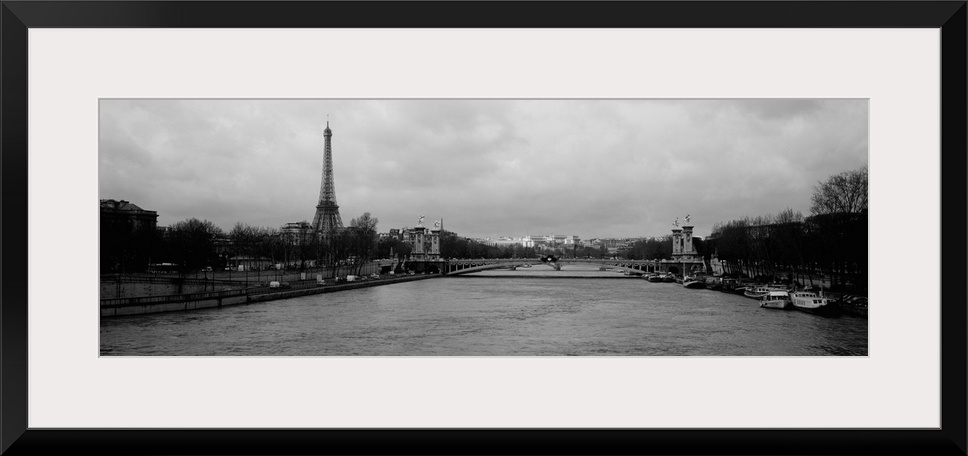 <p>Panoramic photograph taken over the Seine river with the Eiffel tower in the distance and skewed to the left.</p>