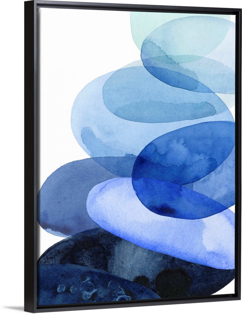 <p>Abstract watercolor painting of oval shapes, representing river stones, stacked on top of each other in shades of blue, on a white background.</p>
