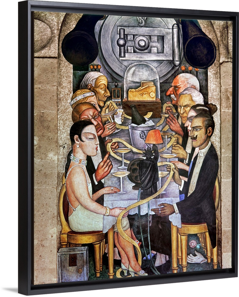 <p>'The Wall Street Banquet.' Wealthy American industrialists read a golden ticker tape. Among them are John D. Rockefeller, Henry Ford and J.P. Morgan. Mural by Diego Rivera at the Ministry of Education in Mexico City, 1928.</p>