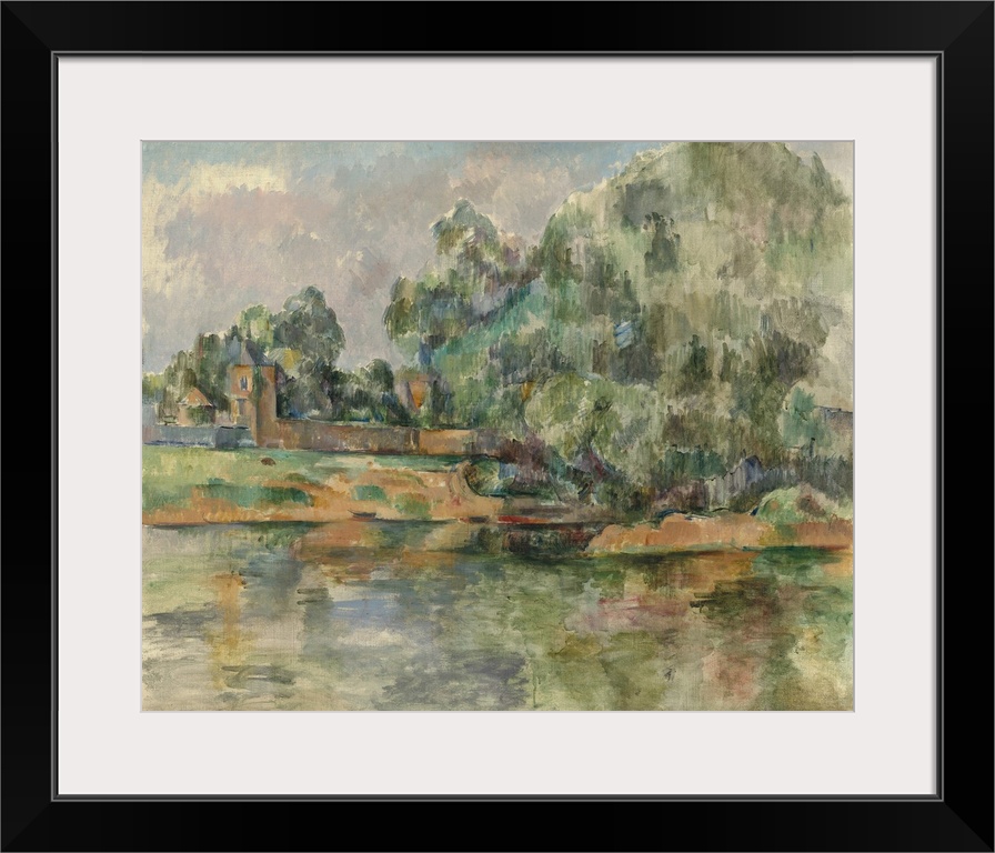 <p>Riverbank, by Paul Cezanne, 1895, French Post-Impressionist painting, oil on canvas. The land, foliage, water, and buildings are fractured into patches of color</p>