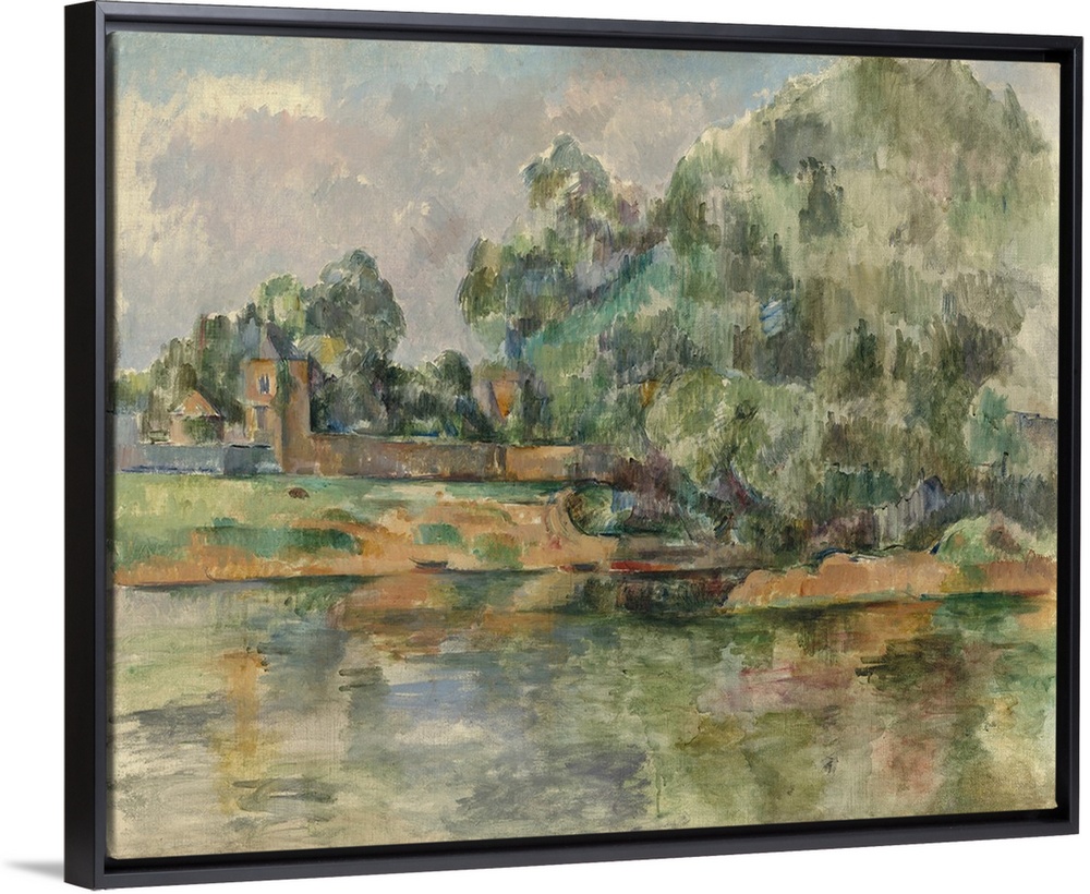 <p>Riverbank, by Paul Cezanne, 1895, French Post-Impressionist painting, oil on canvas. The land, foliage, water, and buildings are fractured into patches of color</p>