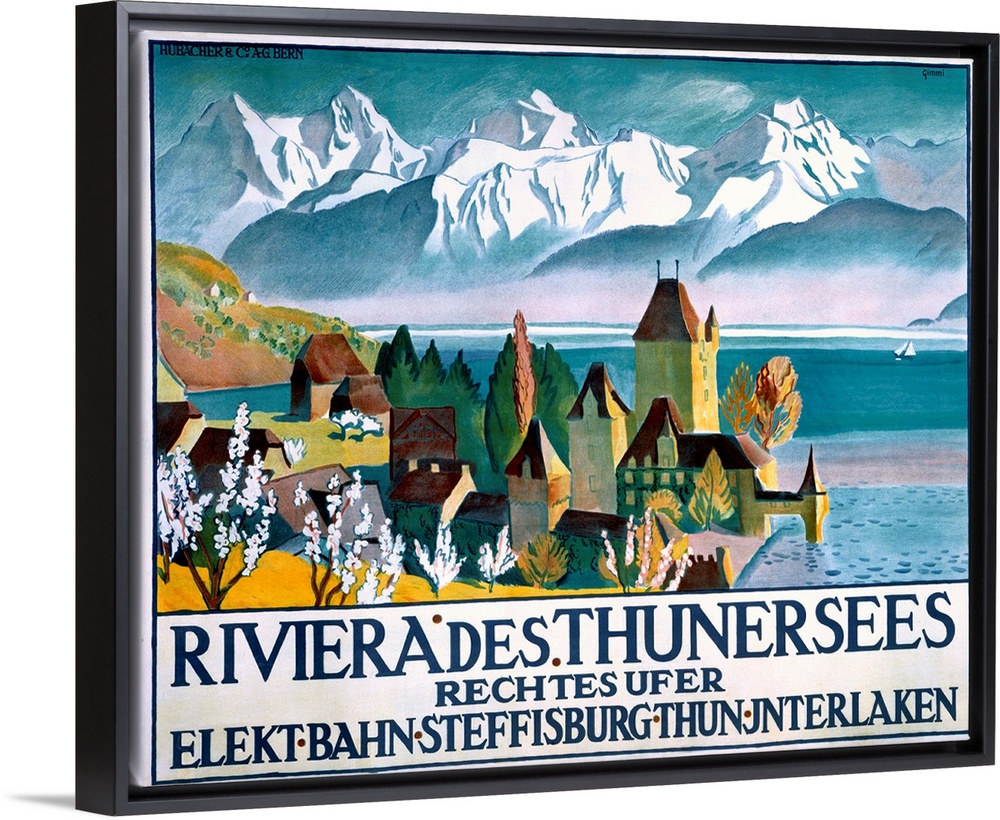 <p>Vintage poster of a small town that sits on the water. Snow topped mountains are drawn in the background.</p>