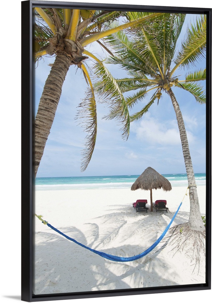 <p>Tropical summer beach resort with chaise lounge beach chairs, hammock and palm trees in Tulum, Mexico.</p>