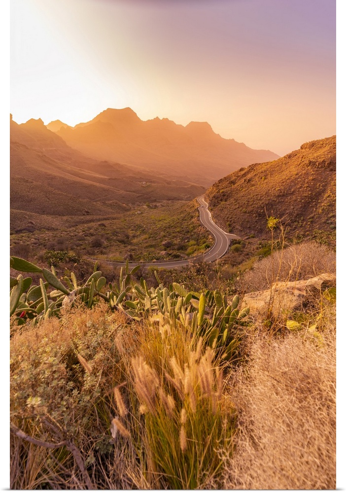 <p>View of road and flora in mountainous landscape during golden hour near Tasarte, Gran Canaria, Canary Islands, Spain, Atlantic, Europe</p>