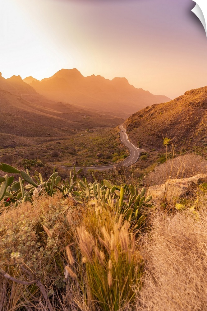 <p>View of road and flora in mountainous landscape during golden hour near Tasarte, Gran Canaria, Canary Islands, Spain, Atlantic, Europe</p>