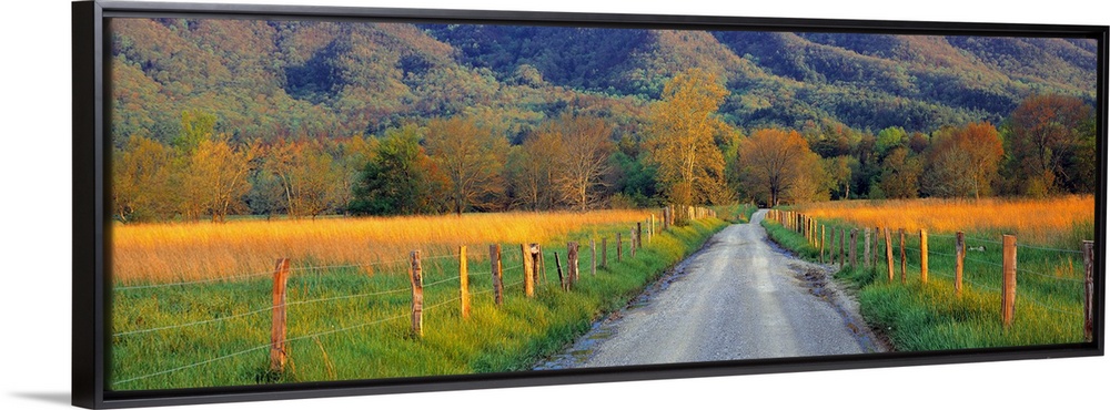 <p>Giant landscape photograph of a gravel road with fenced field on either side, leading toward a horizon of trees and mountains in Cades Cove, Great Smoky Mountains National Park, Tennessee.</p>