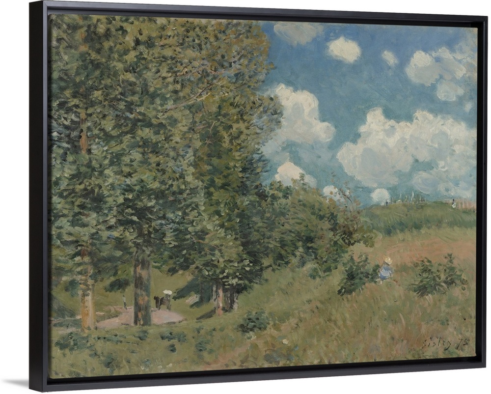 <p>Road from Versailles to Saint-Germain, by Alfred Sisley, 1875, French impressionist oil painting. He painted this plein-air landscape in the bright light of a summer's day, with flickering windblown leaves and grasses. His contemporaries would have consid</p>