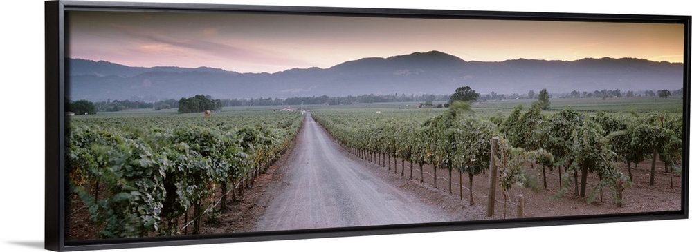 <p>In this large panoramic photograph a road is shown winding its way through a vineyard in Napa Valley, California (CA).</p>