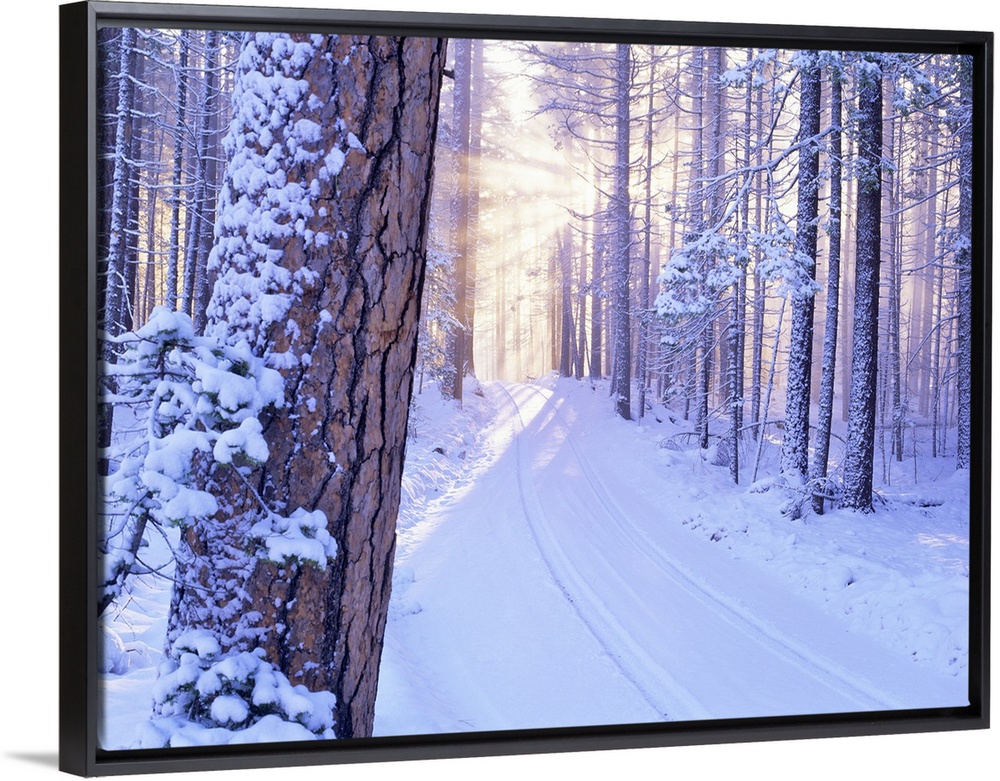 <p>Road in Deschutes National Forest with snow and sunburst. Oregon.</p>