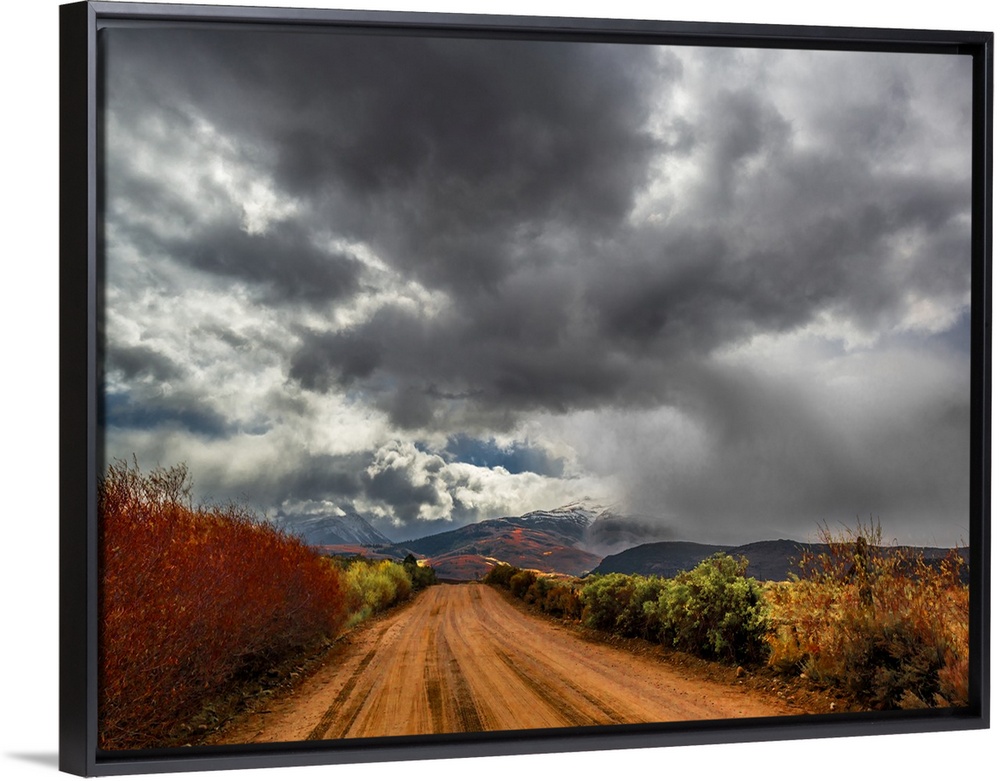 <p>Dark storm clouds over a dirt road in the countryside.</p>