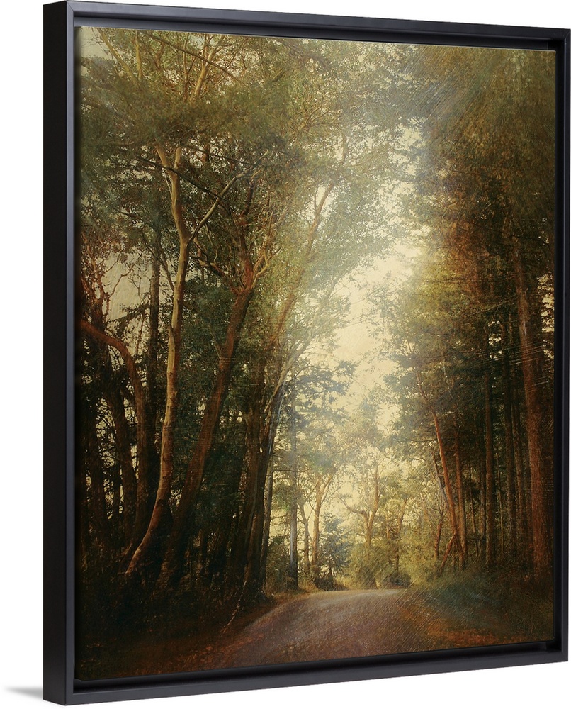 <p>Classical painting of stone pathway curving through forest on a foggy day.</p>