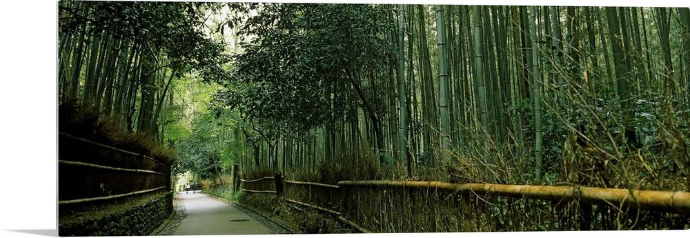 <p>Big, horizontal photograph of a small curving road leading through a very tall forest of dense bamboo, in Arashiyama, Kyoto Prefecture, Kinki Region, Honshu, Japan.</p>