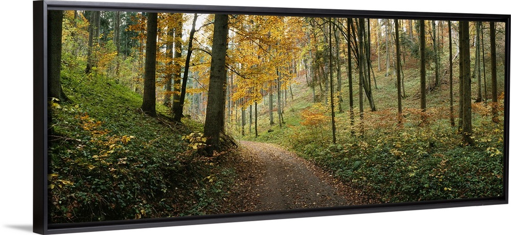 <p>Panoramic photograph of path winding through autumn colored forest.</p>