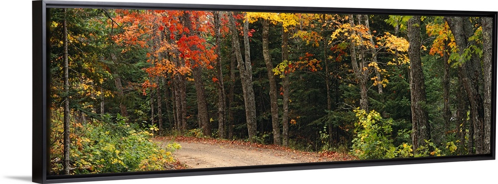 <p>Decorative artwork for the home or office of a thick forest with a dirt road cutting through it.</p>
