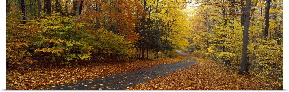 <p>Panoramic photograph on a large canvas of a winding path leading through a forest of fall foliage at Chestnut Ridge County Park, in Orchard Park, New York.</p>