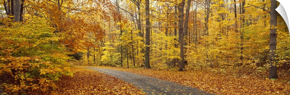 <p>A paved path cuts through a thick forest whose trees have turned colors for the fall season. Leaves have fallen to the ground and cover either side of the road.</p>